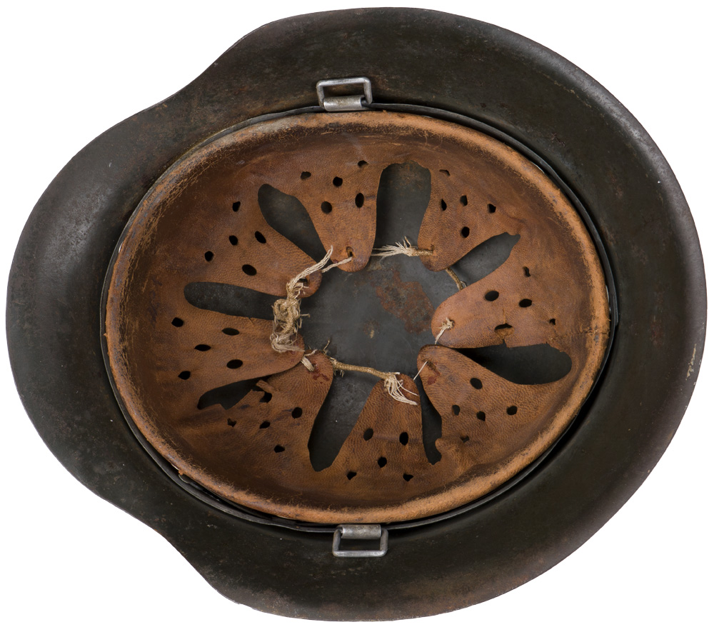 PHYSICAL DESCRIPTION: The stamped, sheet steel construction helmet retains a good portion of its slightly rough textured, age darkened field-grey paint. Wehrmacht eagle shield decal which is retained about 70%. All three liner retaining rivets are intact. The interior of the helmet has an M31 tan leather liner with all eight of its original eight fingers. Liner shows the expected period usage but is still nicely complete and original to the helmet. The interior, reverse, neck guard apron is serial/lot number stamped, "795", and the interior left side apron is stamped (very faint) with the manufacturer’s code and size, "EF64", indicating manufacture by Emaillierwerk, AG Fulda, size 64 (or maybe 66). Decent worn and used M42.