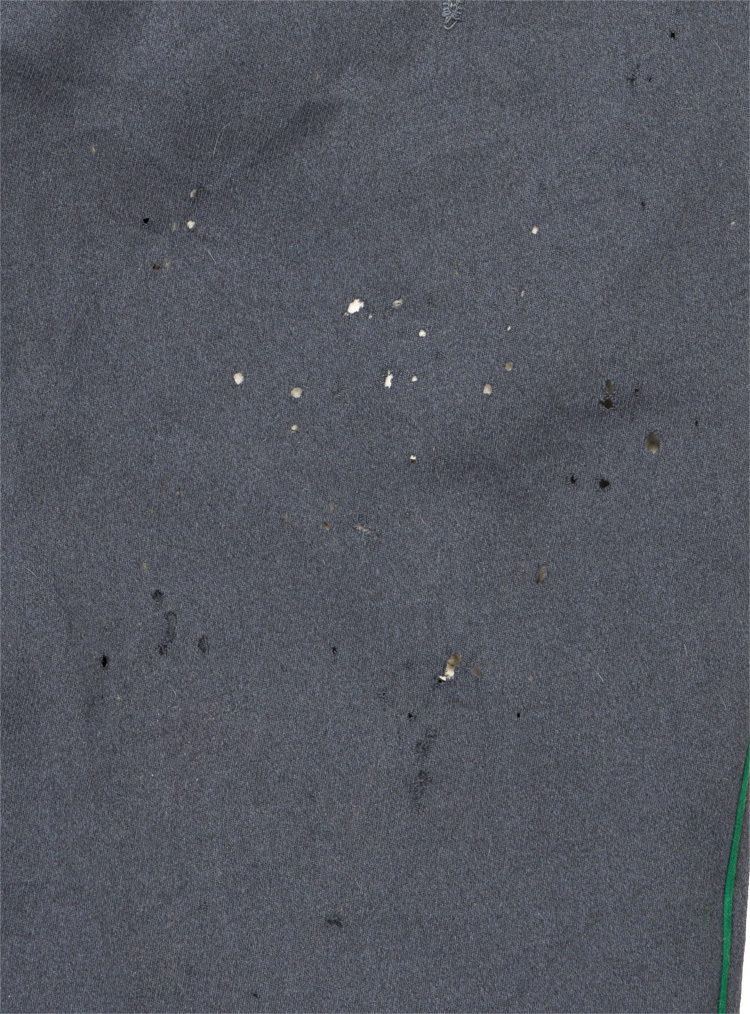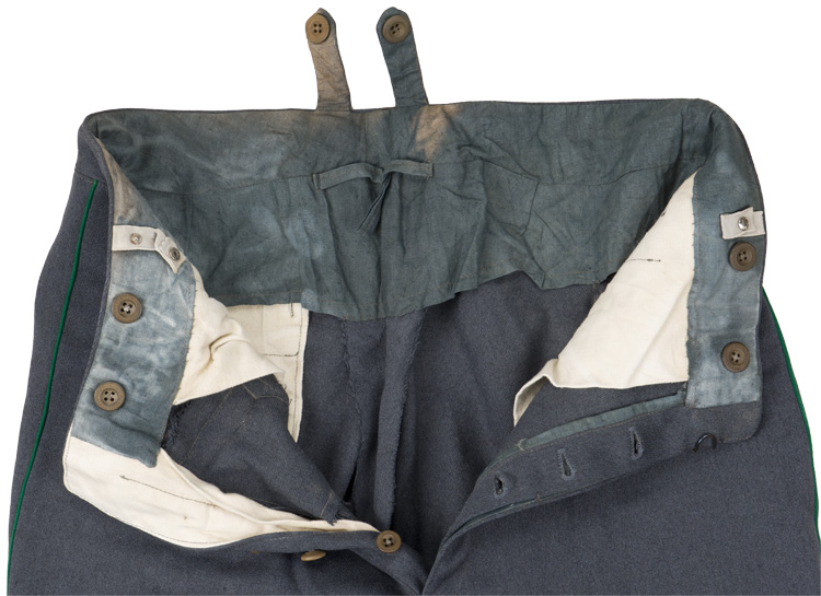 PHYSICAL DESCRIPTION: Nice quality, private purchase, pre-1940, stone grey doeskin wool construction, straight legged dress pants feature a vertical four button closure with an addition hook and eye at the waist. The vertical outside leg seams each have inserted, green wool waffenfarbe piping. The pants have straight cut, dual-ply hemmed, non-adjustable cuffs. The rear right leg/seat area has numerous prick/holes (Not visible from the front) The pants are roughly size 32" waist. All original buttons and stitching.