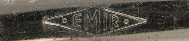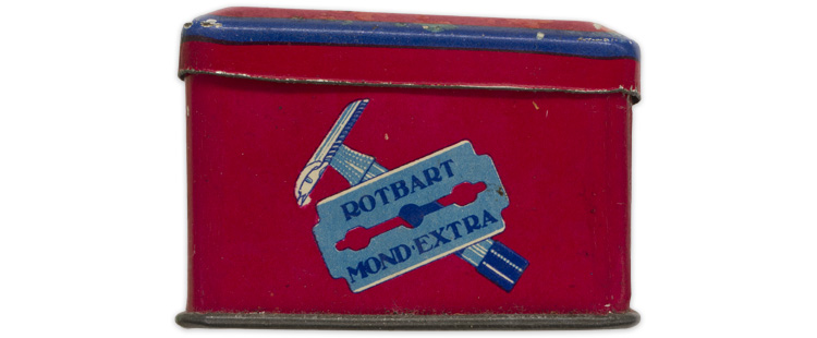 A three-piece, nickel-silver plated alloy, shaving razor in a hinged, magnetic, sheet metal constructed 9cm x 5cm x3cm case. The razor is "EMR" marked to the head of the razor, while the case is marked "Rotbart/Mond-Extra." Included is a package of ten, "Weltfunk Klinge" "Made in Germany" razor blades in their original cardboard box.