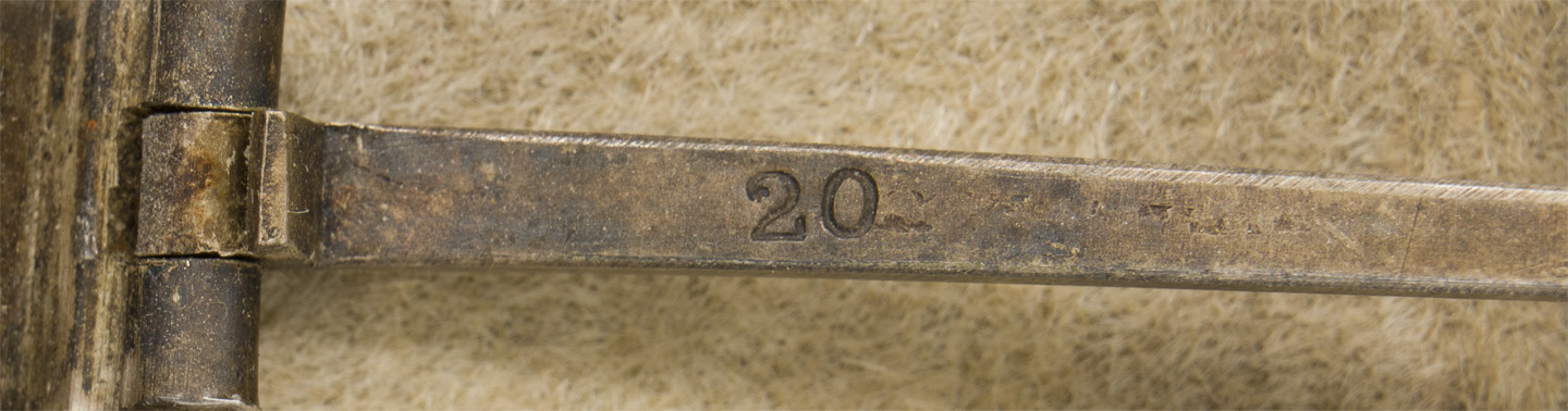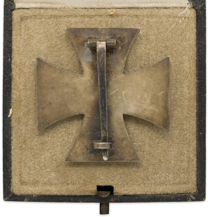 PHYSICAL DESCRIPTION: 1939 pattern, die struck, three piece, iron and nickel/silver plated alloy construction Pattée style cross with a single piece iron core and a two piece alloy frame. The obverse of the award features an embossed, central, canted, swastika with the re-institution date, "1939", to the bottom arm. The swastika stands out in nice, high relief while the date is somewhat lower. The plain reverse has a soldered, block type hinge, a broad, tapering vertical pin and a heavy soldered catch all intact. The reverse of the pin is well marked with the stamped manufacturer’s numerical code, "20", indicating manufacture by C. F. Zimmermann of Pforzheim. The cross comes housed in its original case. Very nicely EK1.