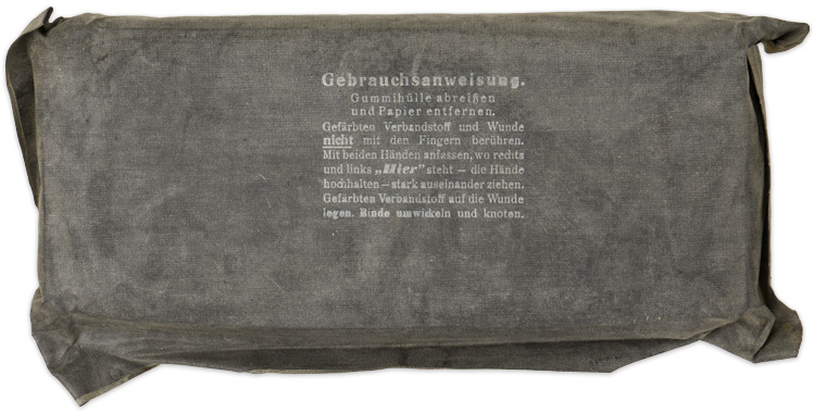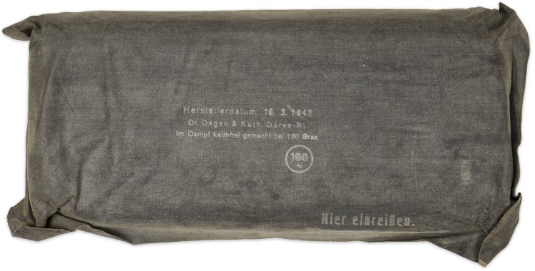 BACKGROUND: Each Division in the German Army of WWII had Divisional Support units which included a medical unit that normally consisted of two companies, a mobile field hospital and two ambulance platoons. Within these medical units EM’s and Junior NCO’s with basic medical training acted as medical orderlies or stretcher bearers under the command of Doctors with Officers ranks. The German army also maintained static hospitals in the rear areas for those with more severe wounds and those with the most serious injuries that would require long rehabilitation times would be sent to a hospital in their home military recruiting district within Germany. Generally the German field units preferred to care for their own wounded as much as possible as a convalescents transferred to a rear area static military or home military district hospital could potentially be dispatched to a new unit on their recovery. As a result most of the Divisional medical support units maintained a generous supply of medical equipment and accessories to provide the most favorable "in-house" care as possible. Among the medical equipment and accessories were a wide variety of bandages, wound dressings and basic first-aid items. Each soldier was issued with a large and a small field dressing and given basic instruction on how to properly dress a wound. These field dressing were designed specifically to fit in the field dressing pocket situated in the bottom right front panel of the field blouse.
