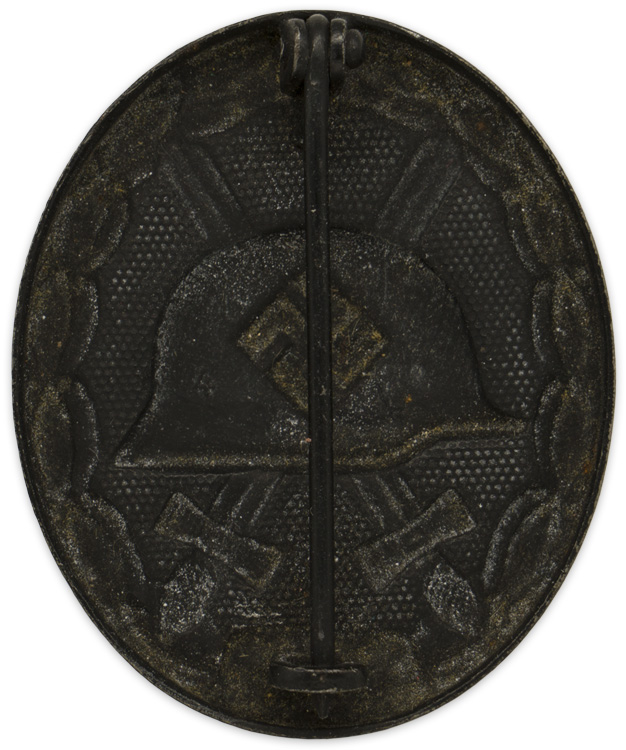 PHYSICAL DESCRIPTION: 1939 pattern, die stamped, magnetic sheet metal construction, hollow backed badge with a black wash. The badge is in the form of an embossed, vertically oval, laurel leaf wreath encompassing an embossed profile of an M35 pattern helmet with a high relief, canted, swastika to the center, superimposed over crossed swords on a pebbled base field. Complete pin and catch assembly. The reverse of the badge is well marked with the embossed manufacturer’s numerical code, "4", indicating manufacture by Steinhauer & Lück of Lüdenscheid.