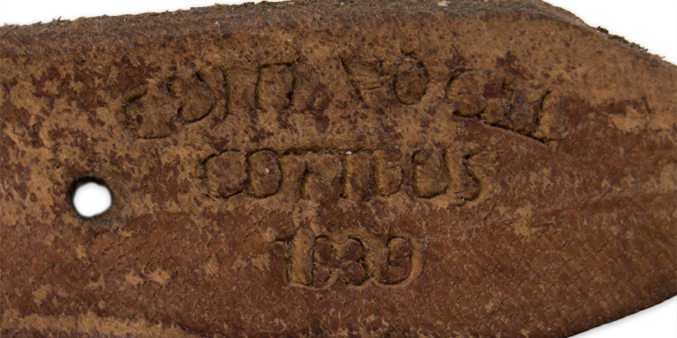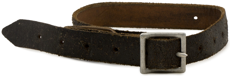 PHYSICAL DESCRIPTION: Two piece leather construction helmet chinstrap with aluminum fittings. Both sections and studs all complete. Maker marked.
