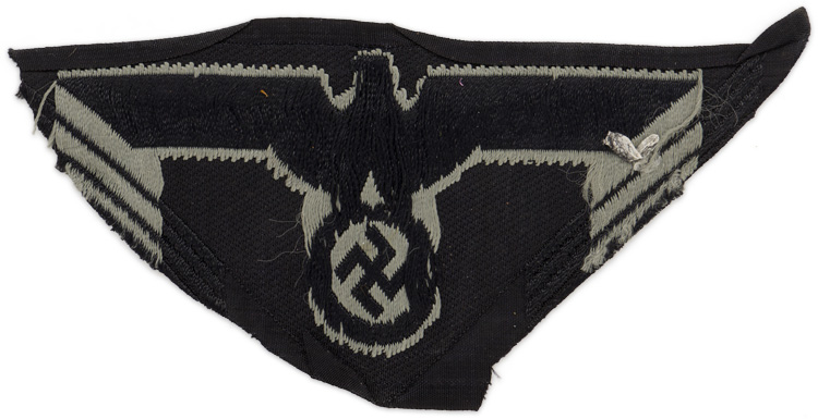 PHYSICAL DESCRIPTION: Later, M44 pattern, machine woven, national breast eagle with outstretched wings, clutching a wreathed, canted, swastika in it’s talons in matte grey rayon threads on a woven, black, inverted triangular, rayon base. The eagle’s wingspan is roughly, 3 3/4", (9.5cm), from wing tip to wing tip. The eagle is still on its original, black, rayon factory roll and is in overall very good, un-issued condition with minimal age toning and fraying to the outer edges of the black rayon factory roll.