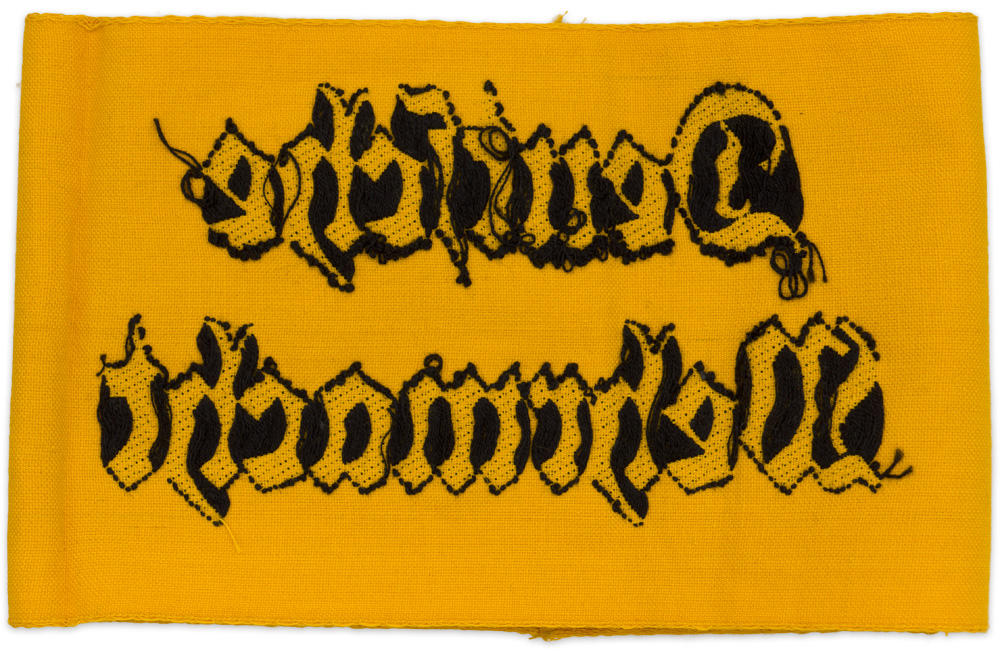 PHYSICAL DESCRIPTION: Roughly, 10.5cm tall, 36cm long, woven, yellow cotton construction armband with machine woven, black, Gothic script in two lines to the obverse, "Deutsche Wehrmacht", (German Armed Forces). The top and bottom edges of the armband have interwoven rows of reinforcement stitching and the reverse of the armband has a machine stitched, vertical seam.