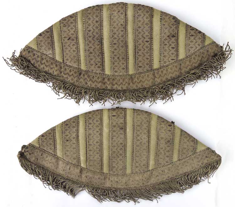 PHYSICAL DESCRIPTION: Two roughly, 10cm tall, 24cm wide, half-moon shaped, matching, Infantry drummers and fifers "swallow’s nests" consisting of a white wool waffenfarbe base with seven, alternating, evenly spaced, machine stitched, vertical, bright, silver/aluminum, diamond patterned, tress stripes and an additional, slightly curved, horizontal, bright, silver/aluminum, diamond patterned, tress stripe to the bottom edge. The white wool base shows through as a narrow, vertical stripe between each of the tress stripes. Silver fringe to the bottom of each (Officer?). The reverse of each "swallow’s nest" has a protective, feldgrau wool backing stitched in place. The reverse of the "swallow’s nests" have five (missing one), evenly spaced, sheet metal attachment hooks. The "swallow’s nests", are in overall very good condition with minor age and usage toning.