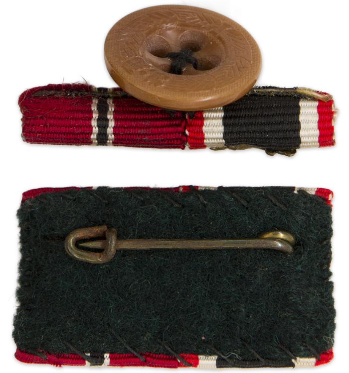 PHYSICAL DESCRIPTION: The two place ribbon bar with a War Merit Cross 2nd class ribbon with a stamped alloy, crossed swords cyphe and a Russian front ribbon that is complete with original pinback device. Included is a matching buttonaire that is handsewn to a bakelite button.