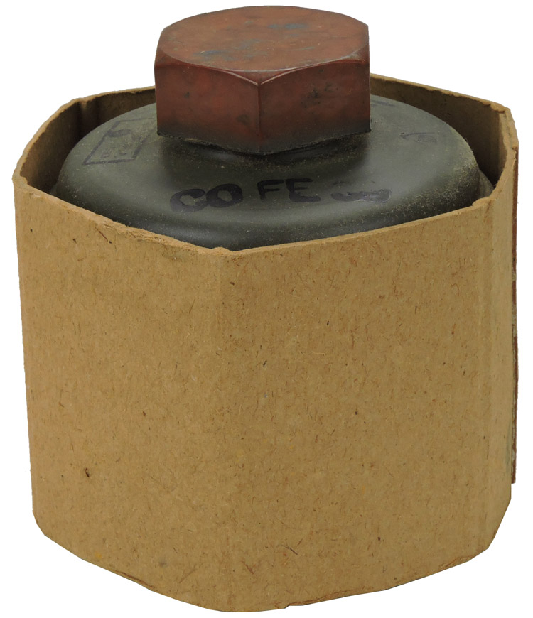 PHYSICAL DESCRIPTION: Early issue, stamped, multi-piece, magnetic sheet metal, Filter Einsatz 39, (Filter Insert 1939). The original, molded, brown bakelite screw cap cover is intact. The bottom edge of the filter has twelve embossed reinforcement ribs and a central, opened, circular air port with an inserted, protective rubber cap intact. The top edge of the filter is well marked with a faint, black inkstamped waffen-amt, the manufacturing date, "1940" and the designation, "COFE 39". Also included is the original factory cardboard packaging. Stone cold mint & nice!