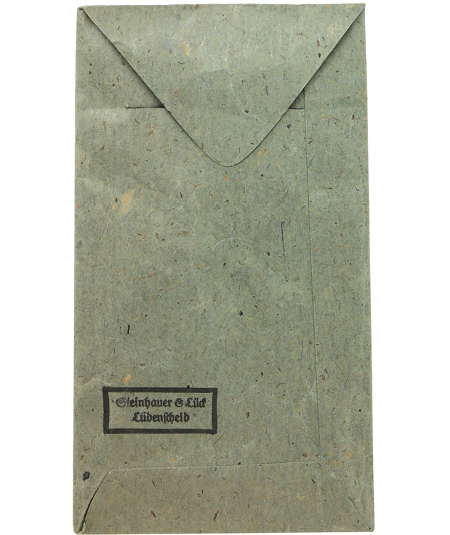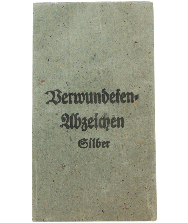 PHYSICAL DESCRIPTION: 1939 pattern, injection molded zinc construction, solid backed badge with a silver wash. The badge is in the form of an embossed, vertically oval, laurel leaf wreath encompassing an embossed profile of a M35 pattern helmet with a high relief, canted, swastika to the center, superimposed over crossed swords on a pebbled base field. The badge only retains hints of its original silver wash and has mostly reverted to the flat, matte grey of the base alloy. The plain, solid reverse has an integral, molded, hinge, a thin, round, vertical pin and an integral, molded, catch all intact. Badge comes complete with its original issue envelope with black printed Gothic script to obverse, "Verwundeten=Abzeichen Silber". Triangular top flap fits into horizontal slash on reverse. Reverse has black printed, Gothic script, manufacturer's name, "Steinhauer & Lück of Lüdenscheid". Envelope still contains the original tissue wrap for the award.