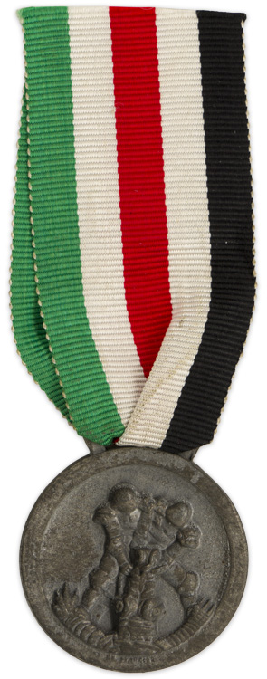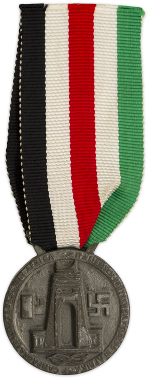 PHYSICAL DESCRIPTION: Roughly 32mm diameter, die struck zinc medal features two embossed, high relief, stylized gladiators, representing Germany and Italy, slaying a crocodile, representing Great Britain to the obverse. The reverse has the embossed likeness of the Feleni arch, the Royal Knot of the House of Savoy, a fasces and a swastika. The outer border of the reverse has embossed script in both Italian and German, "Campagna Italo-Tedesca in Africa", and, "Italienisch-Deutscher Feldzug in Afrika" (Italian-German Campaign in Africa). The obverse of the medal has the embossed designer's and manufacturer's names, "De Marchis" and, "Lorioli Milano" respectively. The medal has an integral ribbon suspension bar and comes complete its piece of original ribbed rayon ribbon in both the German and Italian national colors.