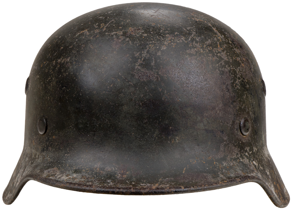 BACKGROUND: The first "modern" steel helmets were introduced by the French army in early 1915 and were shortly followed by the British army later that year. With plans on the drawing board, experimental helmets in the field, ("Gaede" helmet), and some captured French and British helmets the German army began tests for their own steel helmet at the Kummersdorf Proving Grounds in November, and in the field in December 1915. An acceptable pattern was developed and approved and production began at Eisen-und Hüttenwerke, AG Thale/Harz, in the spring of 1916. These first modern M16 helmets evolved into the M18 helmets by the end of WWI. The M16 and M18 helmets remained in usage through-out the Weimar Reichswehr era and on into the early years of the Third Reich until the development of the smaller, lighter M35 style helmet in June 1935. In an effort to reduced construction time and labor costs minor modifications were introduced in March 1940 resulting in the M40 helmet. Further construction modifications were undertaken in August 1942 resulting in the M42 helmet. Originally the Third Reich national tri-color helmet decal was introduced on March 14TH 1933 for wear on the left side of the helmet to replace the Reichswehr era state shield insignia. Regulations of February 17TH 1934 introduced the Wehrmacht eagle decal and the national tri-color decal was shifted to the right side of the helmet with the Wehrmacht eagle decal positioned on the left hand side. Regulations of March 21ST 1940 dictated that the national tri-color decal was to be removed from all helmets and further regulations of August 28TH 1943 abolished the Wehrmacht eagle decal and dictated that it was also to be removed from all helmets although the directives were not completely adhered to.