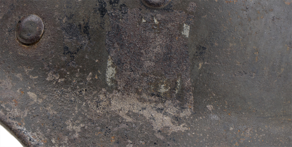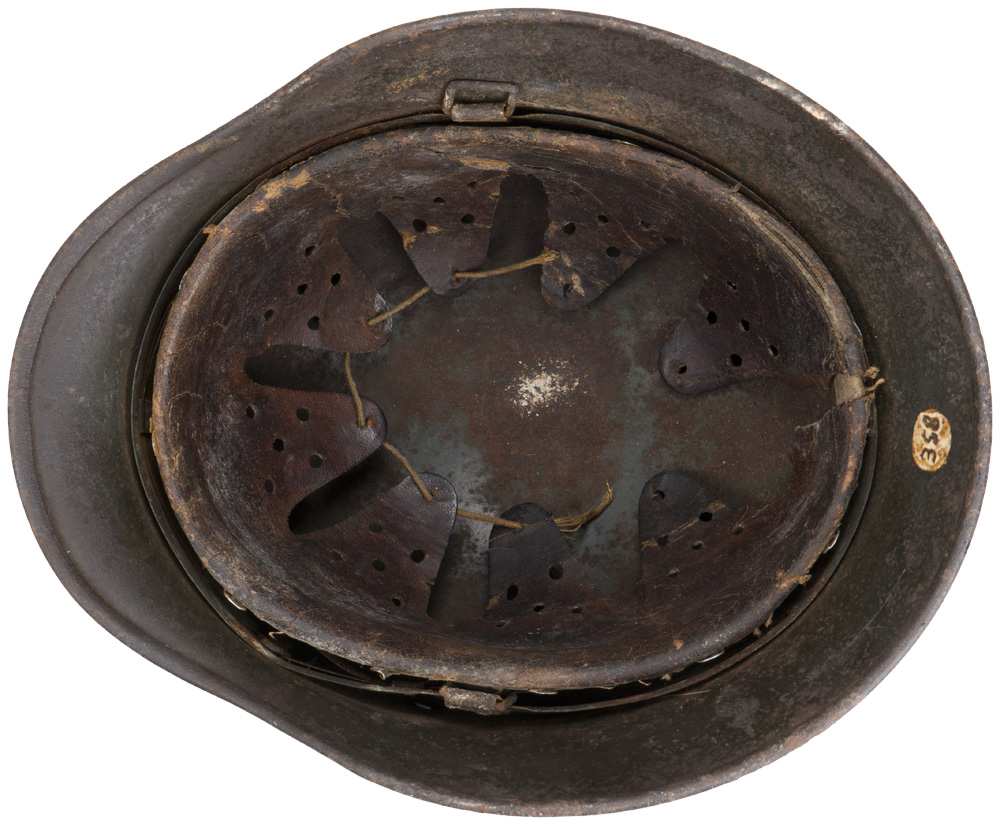 PHYSICAL DESCRIPTION: The stamped sheet steel construction helmet retains a good portion of its feldgrau paint. Decal has been removed. All three liner retaining rivets are intact. The interior of the helmet has a M31 style, leather liner with all of its fingers intact. Liner looks replaced. Can’t make out any size or maker markings because wear/corrosion. I would guess probably a 66 shell.
