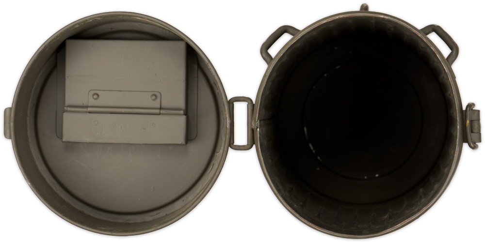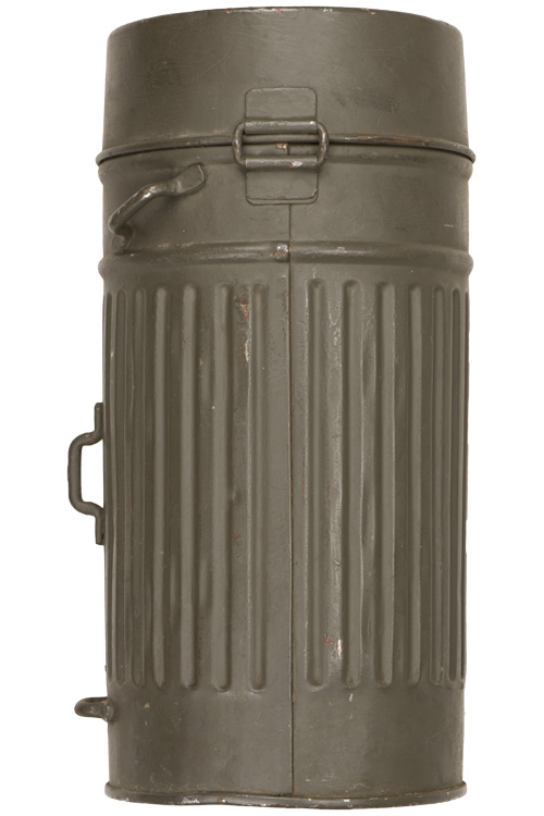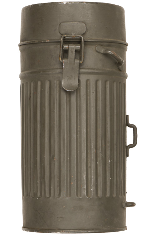 PHYSICAL DESCRIPTION: Early, variant pattern gasmask canister, with unique top lid closure. The corrugated, magnetic sheet metal canister is roughly, 26cm tall with a 12cm diameter. The separate, hinged, top lid has a unique pressure closure clip with a swivel hinge, an extended finger pressure plate and a securing hook. This type of pressure clip is associated with the early, variant pattern M30 models of the gasmask canisters. The canister retains most of its original field-grey paint. The canister has two brazed on, extended arms near the top edge and a third near the center and a fourth near the bottom edge for the carrying and belt support straps. The interior of the top lid has a small, square, hinged compartment for the replacement lenses that is dated for 1934. The bottom of the canister is 1938 dated, along with a WaffenAmt. The canister is a bit misshapen, causing the lid to close tightly.