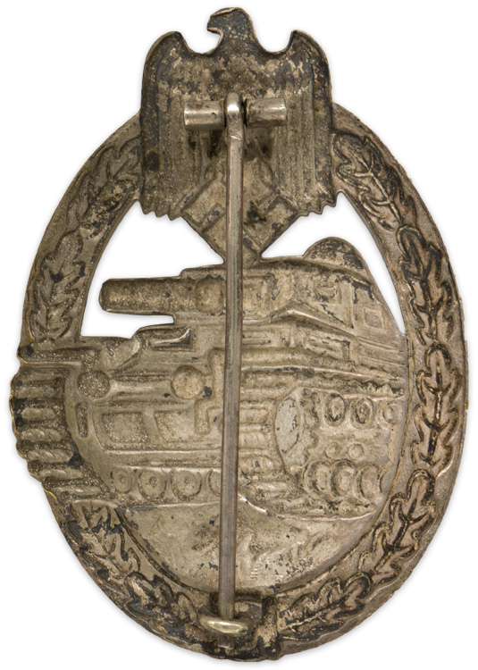 PHYSICAL DESCRIPTION: Nicely detailed, die stamped, hollow backed, alloy construction award with a nickle/silver plate. The badge is in the form of an embossed, vertically oval, oak leaf wreath with a Wehrmacht style eagle with down swept wings, clutching a canted swastika in it’s talons, superimposed to the top center, encompassing the cut out, forward profile of a tank. The wreath, eagle and tank all show nice detailing. The reverse of the badge is a mirror image of the obverse and has a crimped, soldered, hinge, a thin round vertical pin and complete catch.
