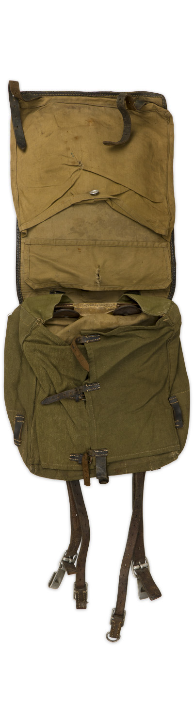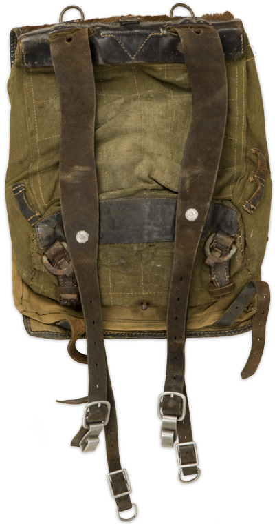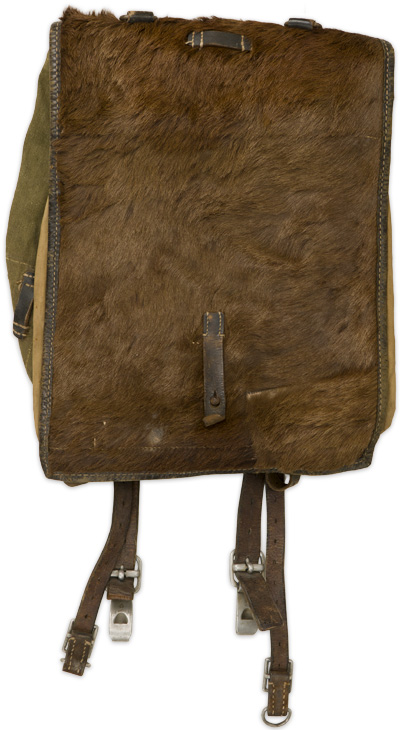 PHYSICAL DESCRIPTION: An olive drab canvas pack with leather and cowhide fittings, roughly 30cm wide, 38cm tall and 10cm deep, with a fold over flap that covers its entire front. Full fur coverage to the main flap. Looks all complete and in decent condition.