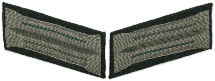 PHYSICAL DESCRIPTION: Second pattern general issue EM/NCO’s collar tabs as introduced on May 9TH 1940 for wear by all branches of service. The machine woven collar tabs feature light grey/green ribbed litzen with mouse grey branch of service and center stripes. The collar tabs are machine stitched to blue/green badge cloth/wool bases, which are mounted on a light buckram backings.