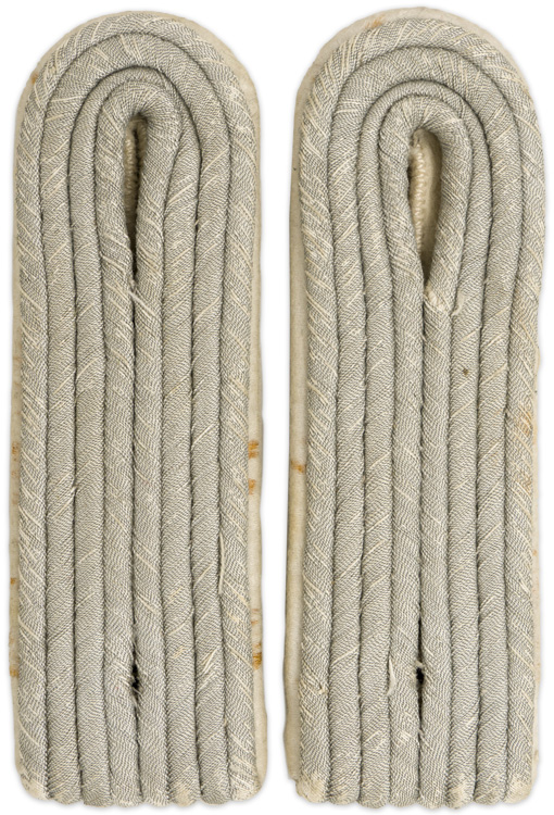 PHYSICAL DESCRIPTION: Slip on shoulder boards of matte, silver/aluminum Russian braid mounted on white wool waffenfarbe bases. Looks like they had a rank pip removed at some point.
