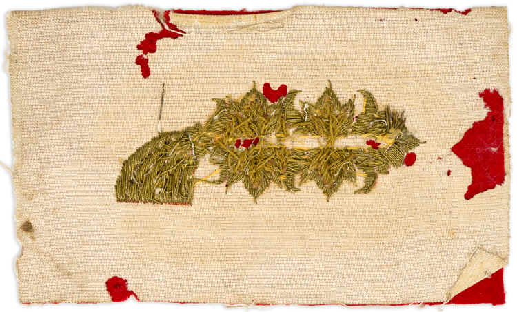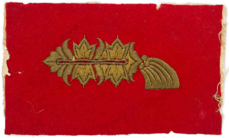 PHYSICAL DESCRIPTION: Left hand side collar tab with a red wool base and hand embroidered Arabesque style "Larisch" pattern ornamentation in gilt bullion wire threads. The Larisch pattern ornamentation consists of two, triple pointed, vertical prongs with a decorative, horizontal, arrow head shaped ornamentation at the forward edge and down swept flared tail shaped decoration near the reverse edge. On unfinished wool backing.