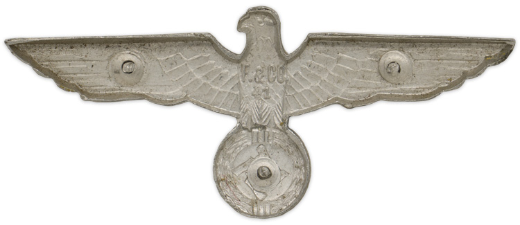PHYSICAL DESCRIPTION: Second pattern, (Circa March 1935 May 1945), aluminum construction national eagle features outstretched wings, and is clutching a wreathed, canted swastika in it’s talons. Missing prongs. Maker marked and dated for 1941.