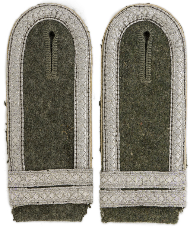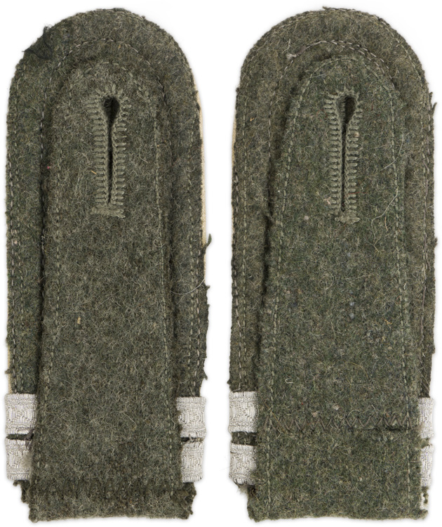 PHYSICAL DESCRIPTION: Later, second pattern, (circa May 1940), field-grey wool construction, slip on shoulder straps with diamond pattern, NCO tress to all but the slip on end and white rayon waffenfarbe. The shoulder straps also have the addition of two, bright, silver/aluminum diamond patterned NCO’s tress loops to the slip on end. The shoulder straps indicates the rank of Unteroffizier while the additional tress loops indicate the owner was an Offizieranwärter, (Officer Aspirant).