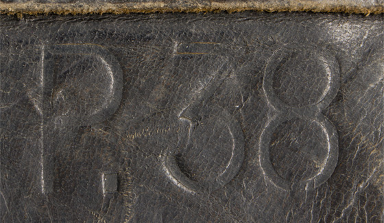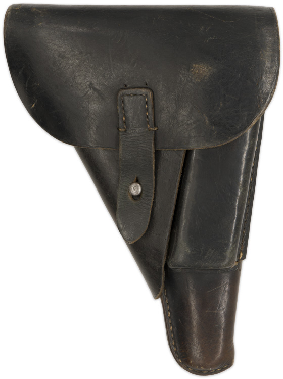 PHYSICAL DESCRIPTION: Second pattern, molded, blackened leather construction, P38 "softshell" holster. The holster features a fold over top flap with a horizontal stitched hinge to the reverse and a stitched on vertical leather closure strap to the obverse. The top flap closure strap attaches to a natural steel stud that is situated on a fold back panel to the left hand side of the holster body. The holster body also has a stitched on, spare magazine pocket to the right front. The reverse of the holster has two slightly diagonally angled stitched on leather belt loops. Faint maker mark to reverse.
