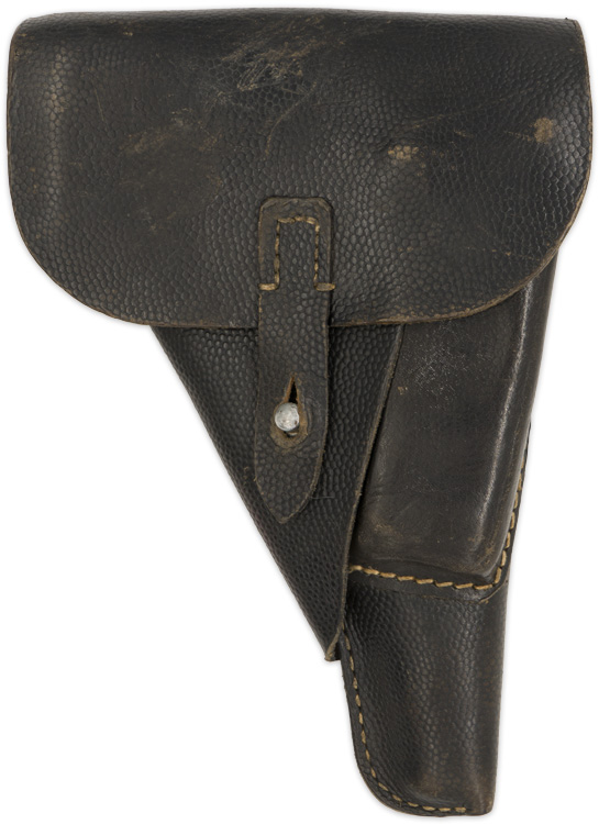 PHYSICAL DESCRIPTION: Second pattern, molded, blackened pebbled, leather construction, P38 "softshell" holster. The holster features a fold over top flap with a horizontal stitched hinge to the reverse and a stitched on vertical leather closure strap to the obverse. The top flap closure strap attaches to a natural steel stud that is situated on a fold back panel to the left hand side of the holster body. The holster body also has a stitched on, spare magazine pocket to the right front. The reverse of the holster has two slightly diagonally angled stitched on leather belt loops. The reverse of the holster is well marked with impressed designation, "P38", a Waffen-amt stamp and the manufacturers three letter code "exe".