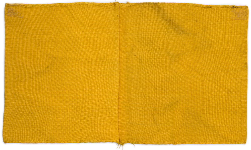 PHYSICAL DESCRIPTION: Woven golden yellow cotton construction armband with a black, machine woven, stylized national eagle with out-stretched wings, clutching a wreathed, canted swastika in its talons to the obverse center. The top and bottom edges of the armband have interwoven rows of reinforcement stitching and the reverse of the armband has a machine stitched, vertical, seam.