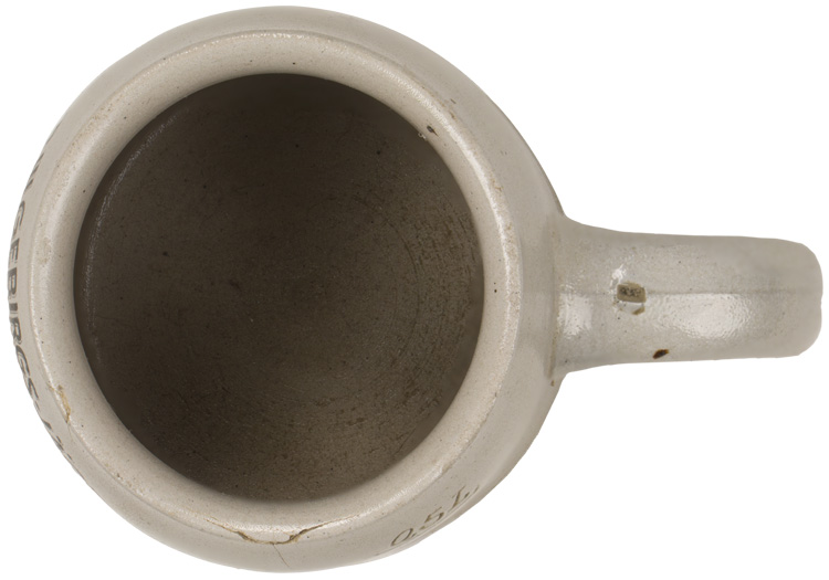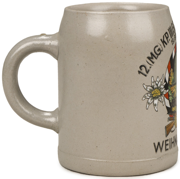 (Stein)Ceramic beer stein, 50mm tall, with commemorative markings for "12. (MG) KP. III. GERBIRGS-JÄGERBATL ", "19. (BAYR.) INF. RGT" and "WEIHNACHTEN 1933". Cavalry Recon unit. Marked "4. Schwadron - Aufkl. Abtlg. 4" Weinachten 1938. Nice large spread winded eagle to the top. An underlined ".05 L." (1/2 Liter) mark is inscribed to the upper left facing side. Excellent condition with the expected light age. Nice.