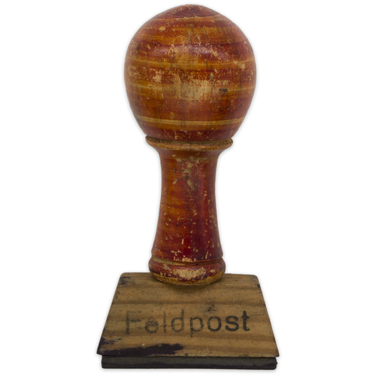 A "feldpost" stamp with wooden handle in original two piece cardboard constructed box. Original tissue paper included. Stamp measures approximately 7cm long.