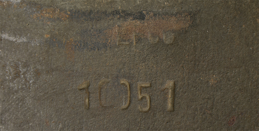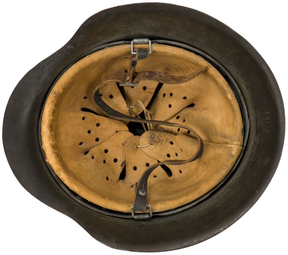 PHYSICAL DESCRIPTION: The stamped, sheet steel construction helmet most of its field grey paint. All three liner retaining rivets are intact. The interior of the helmet has a tan, M31 leather liner with all eight fingers. The interior, reverse, neck guard apron has a stamped serial/lot number "1051" and the manufacturers code and size "EF66", indicating manufacture by Emaillierwerk, AG Fulda, size 66. Of Note: The placement of the manufacturer’s code and size on the interior, reverse, neck guard apron indicate manufacture after mid 1943. EF produced M42's are fairly scarce. Original chinstrap. Nice!