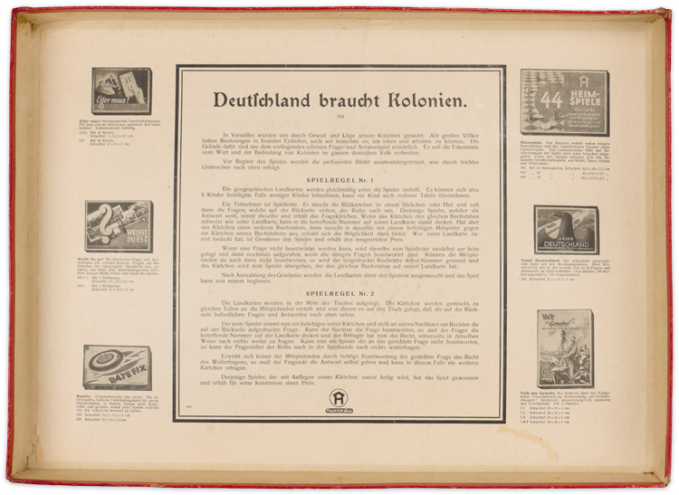 A German Board Game Deutschland Braucht Kolonien ("Germany Needs Colonies). Very rare surviving example of the board game by the famous German toy and game company Hausser Spiele in excellent condition. In the 1930’s, a German political movement sought to regain Germany’s colonial possessions confiscated after WWI. The first line of the game description inside the lid reads (in German) "In Versailles, through force and lies, our colonies were stolen from us." The game is intended to educate German children about the former colonies and their economic value to the Third Reich. Excellent condition, one of very few surviving examples. Appears to be complete. The two piece, cardboard constructed box measures approximately 4cm x 30cm x 41.5cm.