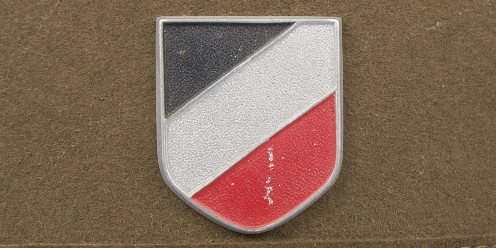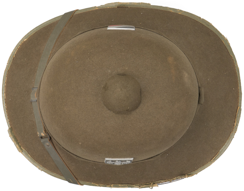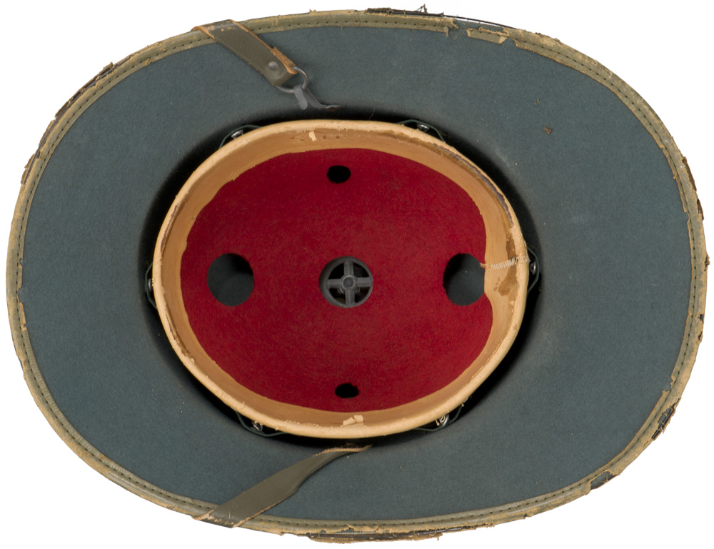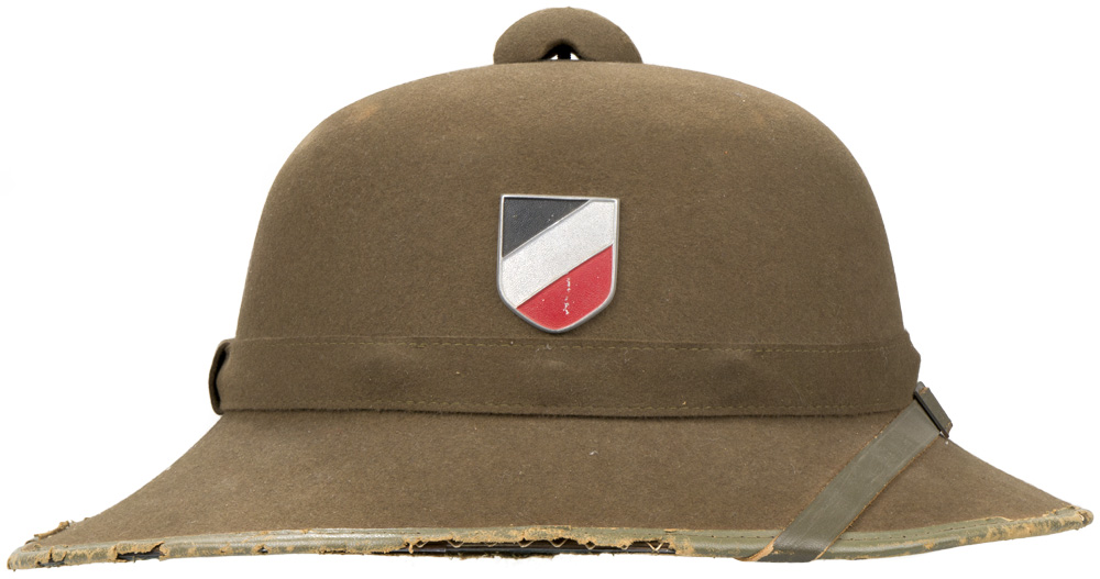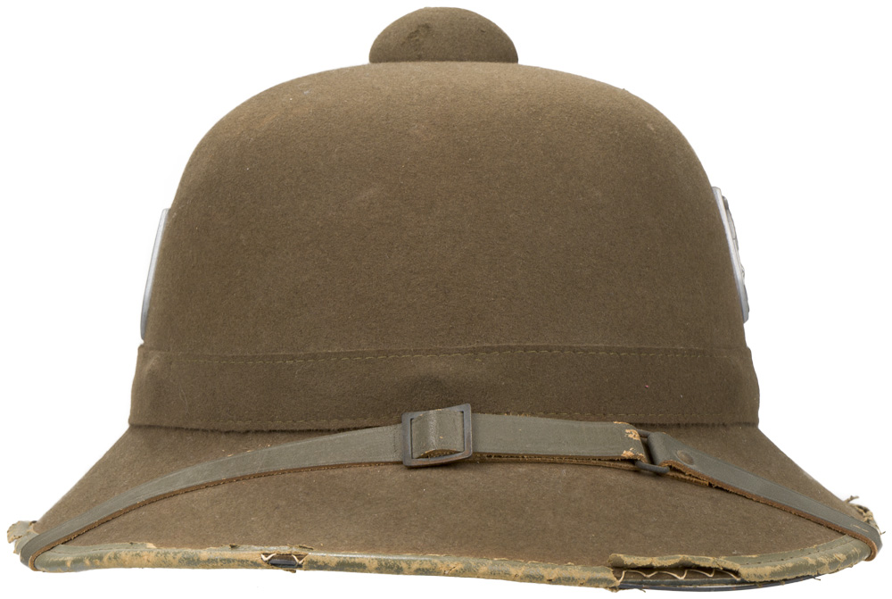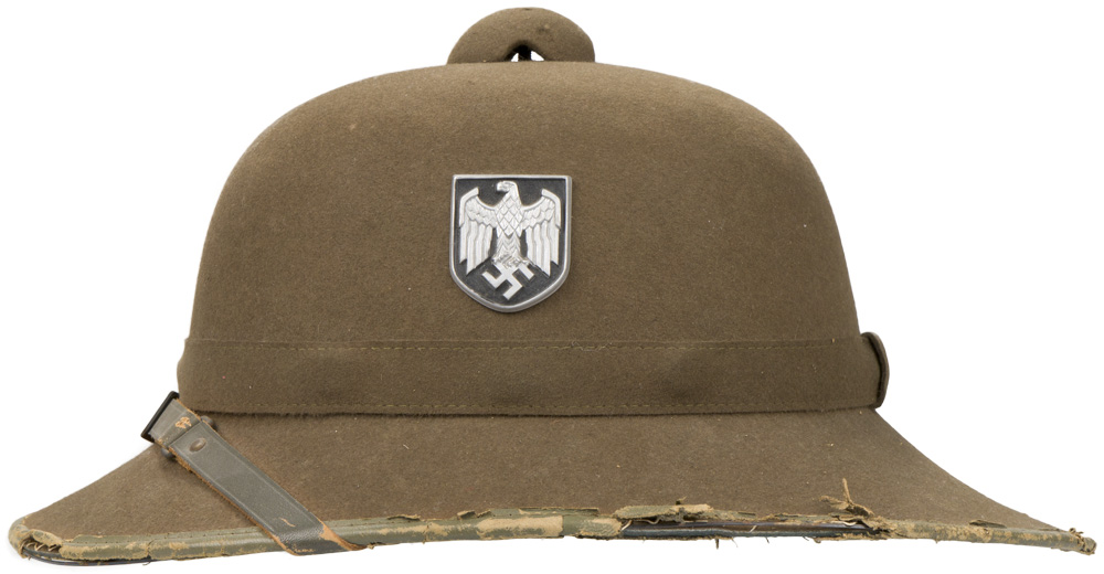 BACKGROUND: In late 1940, with the impending German entrance into the North African campaign, tropical uniforms, headgear and equipment were quickly developed and issued in time for DAK, Deutsches Afrika Korps, (German Africa Corps), personnel’s arrival in Tripoli in February 1941. One of the new headgear items introduced was the tropical pith helmet which was based on the design of the earlier Kriegsmarine pith helmet. On its introduction the pith helmet was constructed of a formed cork base with a cotton twill covering until a second pattern pith helmet was introduced with a formed cork base with a felt covering. The second pattern pith helmet followed the same basic design as the first pattern but was modified to ease production time and material costs. Wear of the pith helmets was extended to personnel serving in southern areas of continental Europe but the helmets proved ineffective and unpopular and manufacture was discontinued sometime in 1942.