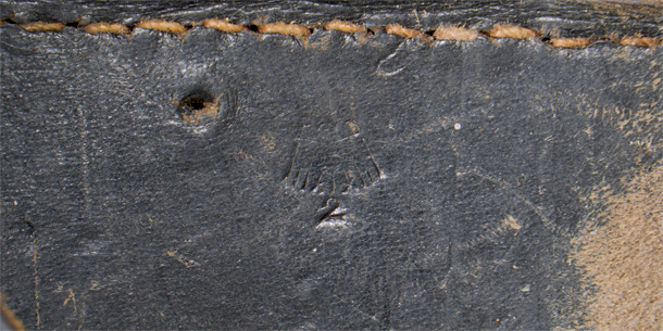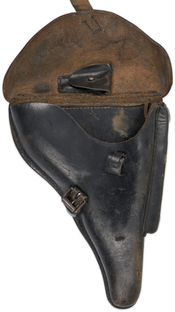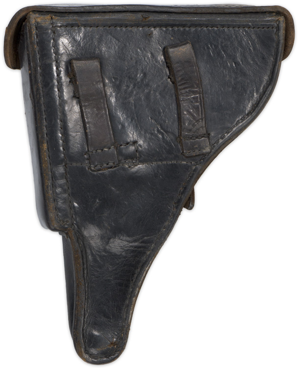PHYSICAL DESCRIPTION: Smooth molded leather hard shell holster for the standard 4" barrel P08 Luger. Holster features a top scalloped flap with horizontal stitched hinge to reverse and a slightly diagonally angled stitched on closure strap to obverse. Closure strap attaches to leather reinforced magnetic pronged roller buckle stitched to holster body. Extra magazine pocket stitched to holster front edge with semi circular cut out to top edge for ease of accessing extra magazine. Internal quick release pull strap inserted through small horizontal slash to holster front. Reverse with dual, slightly diagonally angled, belt loops stitched in place. Interior of top flap has a small pocket with steel stud closure for the take down tool.