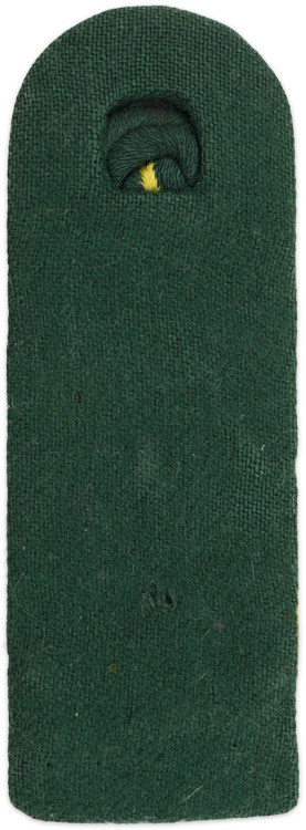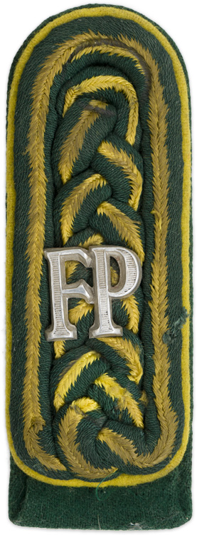 PHYSICAL DESCRIPTION: Pre 1940 pattern, sew on shoulder board of intertwined, dark green rayon braid with a fine lemon yellow rayon cord separating the two outer and inner braids and the silver washed, conjoined, stamped alloy, Latin letter cypher, "FP", indicating, Feldpost, (Field Post). The shoulder board is mounted on a dark green wool waffenfarbe base with a lemon yellow rayon nebenfarbe cord sandwiched between the top, dark green rayon braid and the dark green wool base and is just visible at the sides. The shoulder board indicates the Field Post rank/position of Feldpostbote which is the equivalent of army rank of Unteroffizier. Scarce Field Postal service shoulder board.