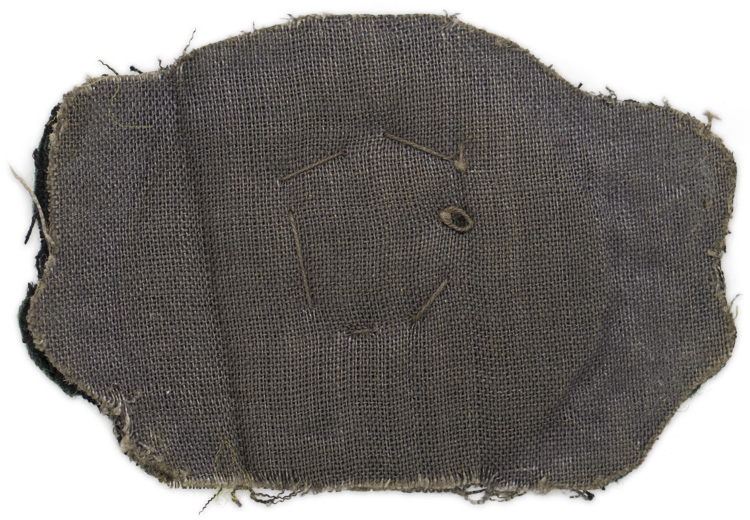 PHYSICAL DESCRIPTION: Nice quality, second pattern, (circa 1935 1945), hand embroidered, opened topped, oak leave wreath with six, small, acorns in bright, silver/aluminum wire threads and hand embroidered national tri color cockade all mounted on a cut out, padded, blue/green badge cloth base.
