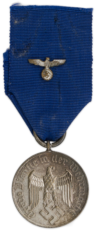 PHYSICAL DESCRIPTION: Silver washed, die struck, magnetic sheet metal construction, fourth class award for four years service, features an embossed Wehrmacht, (Armed Forces), style eagle with down swept wings, clutching a canted, swastika in it’s talons, encompassed by Gothic script, "Treue Dienste in der Wehrmacht" (Loyal Service in the Armed Forces), on a smooth background field to the obverse. The reverse has a large embossed numeral, "4" to the center encompassed by an embossed, circular, oak leaf wreath. Complete with original ribbon & eagle cypher.