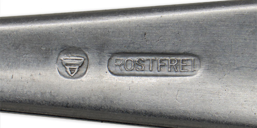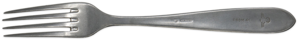 PHYSICAL DESCRIPTION: Roughly, 21cm long, one piece, stainless steel construction four tine mess hall fork. The reverse of the handle is well marked with an impressed national eagle with out stretched wings and the manufacturers name and 1941 date.