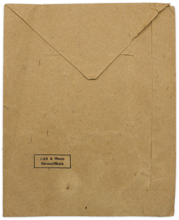 PHYSICAL DESCRIPTION: A 10.5cm x 13cm tan, light weight card stock issue envelope with black typed Latin script to its front. Maker marked.