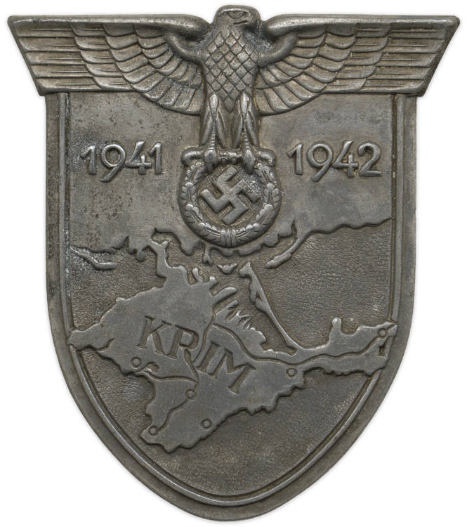 PHYSICAL DESCRIPTION: The award is in the form of a vertical, die stamped, sheet metal construction, shield with a bronze wash featuring a large embossed national eagle with out-stretched wings, clutching a wreathed, canted, swastika in it’s talons, to the top center, situated above an embossed, stylized, map of the Krim peninsula with the embossed dates, "1941-1942", and the impressed location, "Krim". The recessed "water" surrounding the peninsula has a subtly pebbled, background field. The edge of the shield has a fine, embossed, line and a stepped down outer edge. Three of the original four prongs remain.