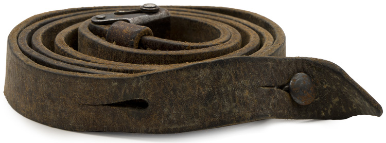 PHYSICAL DESCRIPTION: Age and usage darkened brown leather sling. One end of the sling is pointed with dual stud holes and a corresponding dual headed stud for fastening it to the weapon. The opposite end of the sling has a steel grasping buckle with an internal gripping bar, stitch in place. The sliding leather retaining loop is complete. No visible markings. Shows the expected period use and wear but overall intact and in usable condition.