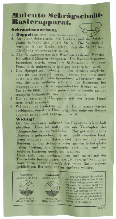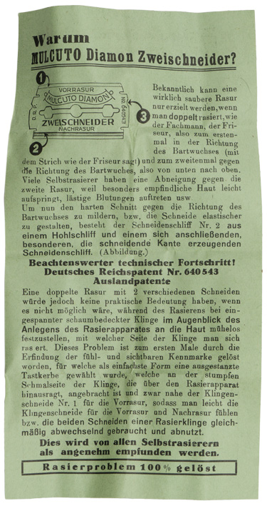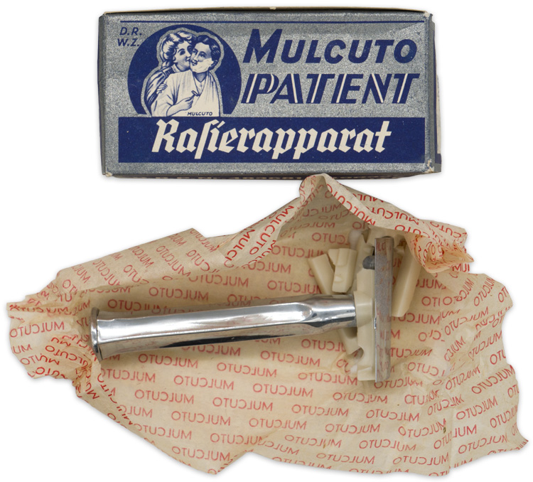 An original "Mulcuto Patient” two piece razor with printed instructions of use and care. The razor comes wrapped in original “Mulcuto” paper. Part of the housing of razor is broken, but the pieces are present. The carton shows light to moderate usage and wear to the surface. The razor measures approximately 8.5cm long, while the box measures approximately 2.5cm x 5cm x 9cm.