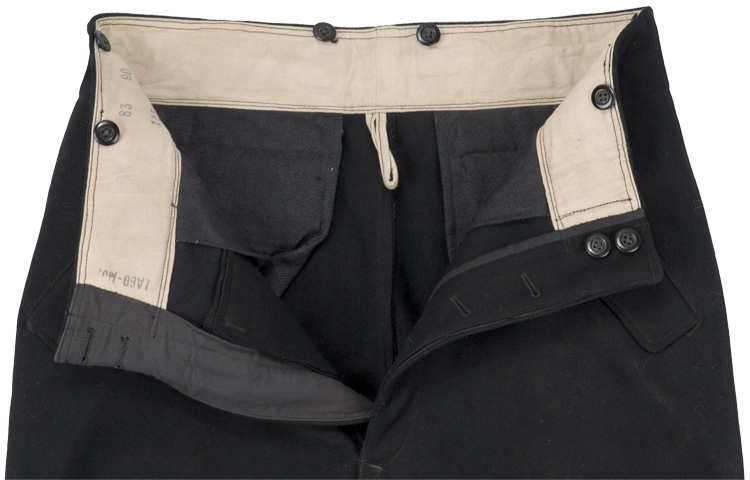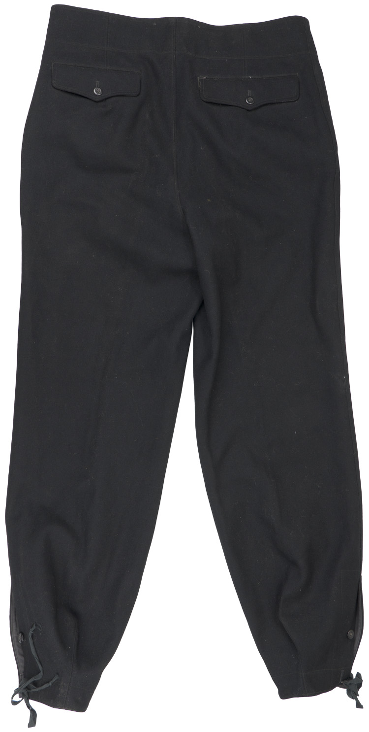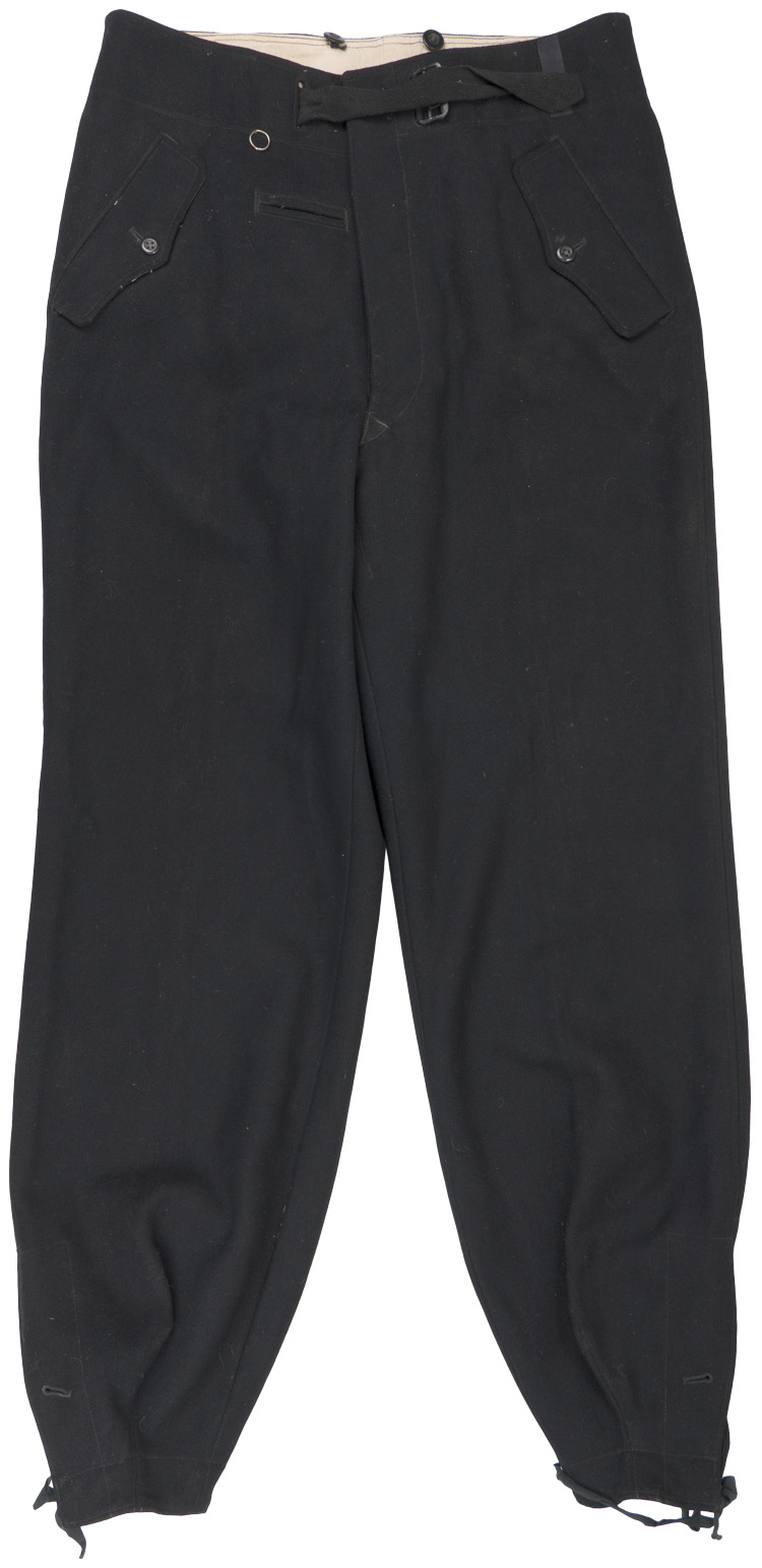 BACKGROUND: The German army utilized a wide variety of long trousers and breeches including the M35 dress pants, the standard straight legged long pants, assorted breeches, drill and field pants, tapered "keilhose" pants and assorted specialized pants designed for specific branch of service personnel such as the Mountain troopers pants and the Panzer and Assault Gunner’s pants. The black Panzer Wrap tunic and pants were originally introduced by the army on November 12TH 1934, for wear by armored vehicle personnel and were worn through out the war with minor modifications. Allegedly the Chief of the motorized troops, Oberst Heinz Guderian came up with the coloration and design of the form fitting uniform which he based on a popular ski outfit of the time. Black was chosen as the color as it help conceal the grease and grime commonly encountered by motorized personnel. Officers and certain senior NCO ranks were responsible for purchasing their own uniforms and as a result were allotted a clothing allowance through the army’s Kleiderkasse, (Clothing Account), system. The Officers and certain senior NCO’s could choose to purchase their uniforms from the armed forces clothing depots or to privately purchase garments of higher quality. Although enlisted personnel were issued their uniforms from government supplies they were also permitted to purchase privately tailored uniforms although the price may have been restrictive.