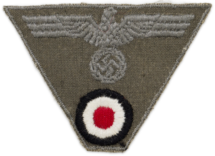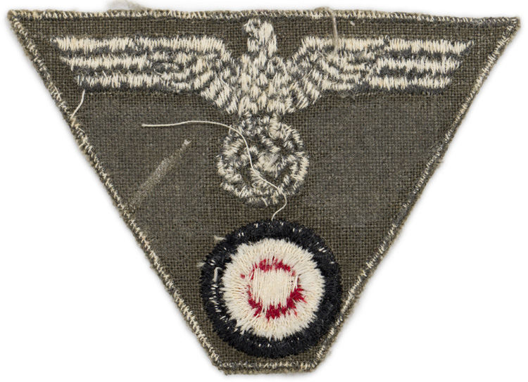 PHYSICAL DESCRIPTION: Machine embroidered national eagle with outstretched wings, clutching a wreathed, canted, swastika in it’s talons in silver/grey rayon threads, positioned above a national tri color cockade with a black outer circle encompassing a white inner circle and a red center dot, on a loosely woven, brownish/field grey rayon trapezoidal base. The outer edge of the trapezoidal base has reinforcement stitching in the same silver/grey threads as the eagle.