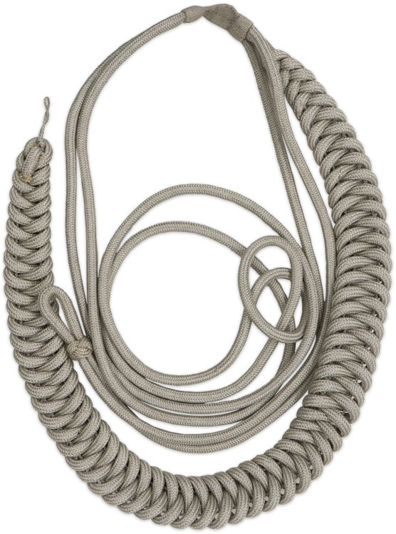PHYSICAL DESCRIPTION: Reichswehr pattern, (Circa July 1927-June 1935), officer’s dress aiguillette consists of a section of dual, interwoven, bright, silver/aluminum braids, single, looped, braid and an additional single, looped, braid all attached to a small, central, button holed, silver/aluminum rectangular panel.