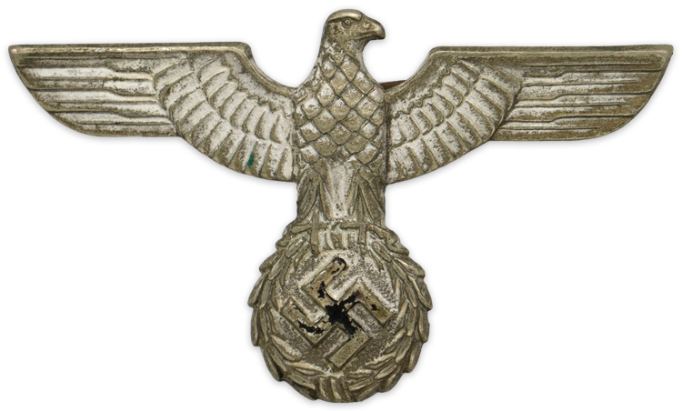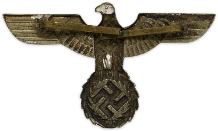 PHYSICAL DESCRIPTION: Early first pattern, (Circa February 1934 March 1935), die stamped, alloy construction national eagle with outstretched wings, clutching a wreathed, canted swastika in its talons. The eagle has a roughly, 50mm wingspan and is slightly convex to fit the contours of a cap. The reverse of the eagle is a mirror image of the obverse and has both of its original soldered attachment prongs intact.