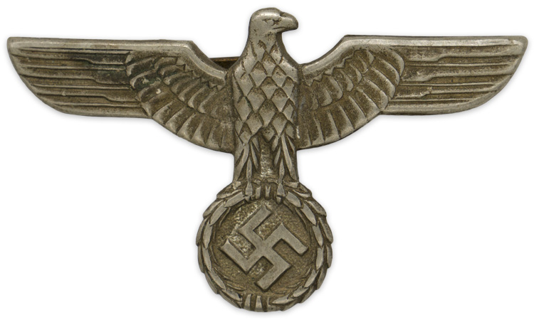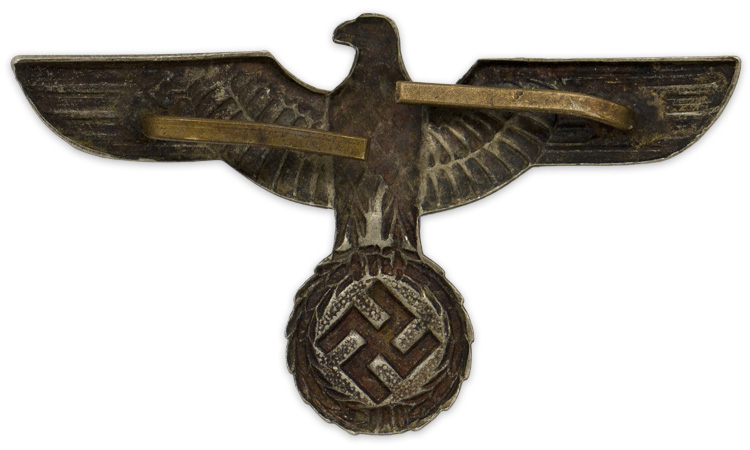 PHYSICAL DESCRIPTION: Early first pattern, (Circa February 1934 March 1935), die stamped, alloy construction national eagle with outstretched wings, clutching a wreathed, canted swastika in its talons. The eagle has a roughly, 50mm wingspan and is slightly convex to fit the contours of a cap. The reverse of the eagle is a mirror image of the obverse and has both of its original soldered attachment prongs intact.
