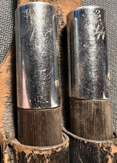 A pair of wooden sticks measuring approximately 42cm long with silver ends that have hollowed, triangular shape that fit on the spanner bolts of the drum for tuning. The capped ends are a bit loose against the wooden stick. Included is a leather