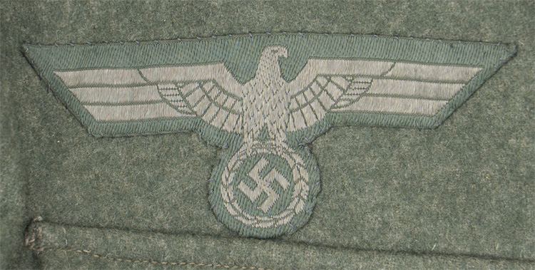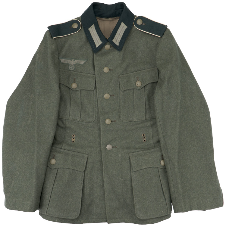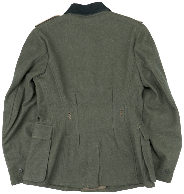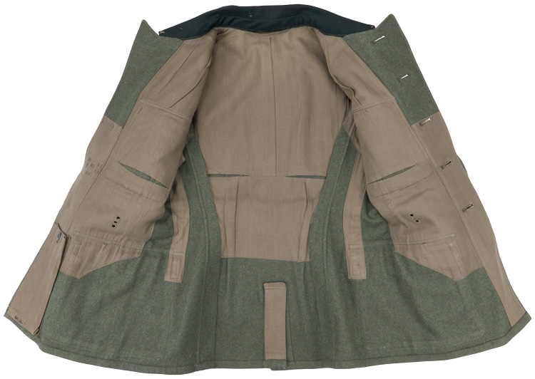 BACKGROUND: The M40 field blouse was basically a continuation of the modifications of the M33 field blouse which had evolved into the M36 field blouse. Modifications to the M36 field blouse included alteration of the bright silver/aluminum NCO tress and rank chevrons to a less visible subdued matte grey tress in April 1940, and changing the blue/green badge cloth collar to a field grey basic cloth collar in May 1940. These alterations resulted in the M40 field blouse. Of Note: Although the bright silver/aluminum NCO tress and rank chevrons were to be replaced with the less visible subdued matte grey tress, it is not uncommon to find the brighter tress still in use on the M40 or even later produced field blouses. Officers and certain senior NCO ranks were responsible for purchasing their own uniforms and as a result were allotted a clothing allowance through the army’s Kliederkasse, (Clothing Account), system. The Officers and certain senior NCO’s could choose to purchase their uniforms from the armed forces clothing depots or to privately purchase garments of higher quality. Although enlisted personnel were issued their uniforms from government supplies they were also permitted to purchase privately tailored uniforms although the price may have been restrictive.