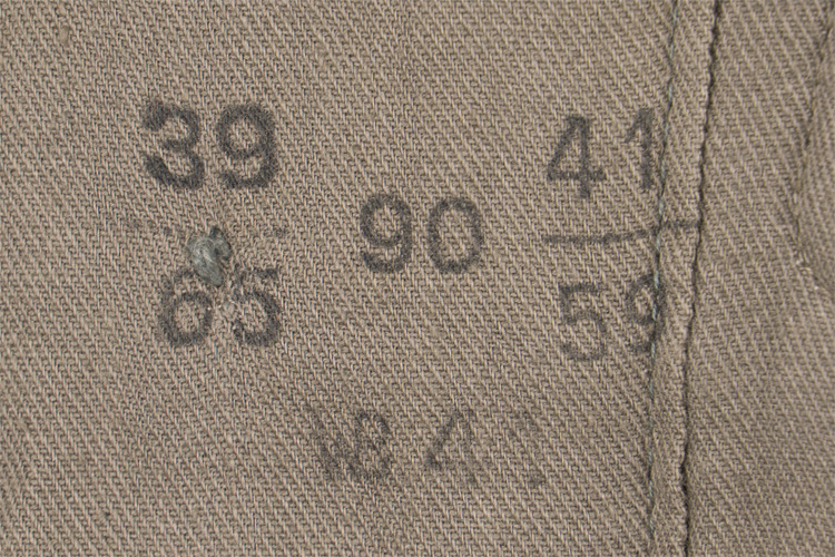 PHYSICAL DESCRIPTION: Field grey, wool/rayon blend construction, issue M40 field blouse features a vertical, five button front closure with a single metal hook and eye positioned at the neckline. The field blouse has four, pleated, front pockets with scalloped edged button down flaps. The breast pockets are the basic patch type while the hip pockets are the saddlebag type with expanding side panels. The field blouse has four sets of three, vertically aligned, stitched eyelets with one set situated at either side of the front closure and two to either side of the back panel, at the waistline. The eyelets were designed for the belt support hooks. The straight cut sleeve cuffs each have a vertical slash to the outside seam with a fit adjustment button. The shoulder straps fabric retaining loops and buttons are all intact. Comes with a nice pair of slip on Infantry EM shoulder straps. The M36 style, dark green, wool lay down collar has the typical zigzag reinforcement stitching. Collar tabs are original application. The interior of the field blouse is partially lined in ribbed grayish/tan cotton twill, with the lining running down the front closure panel edges and to the upper breast and back panels. The right front tail skirt lining has a field dressing pocket with a single button closure. Superb original maker, size markings present. Buttons all look to be original stitching. Chest size is 90cm (35"). Very nice original application eagle. Some expected nap wear. Wonderful tunic, M40's are getting difficult to find.