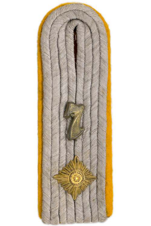 PHYSICAL DESCRIPTION: Slip on shoulder board of matte silver/aluminum Russian braid with single gilt washed rank pip and unit number “7” mounted on a golden yellow wool waffenfarbe base.